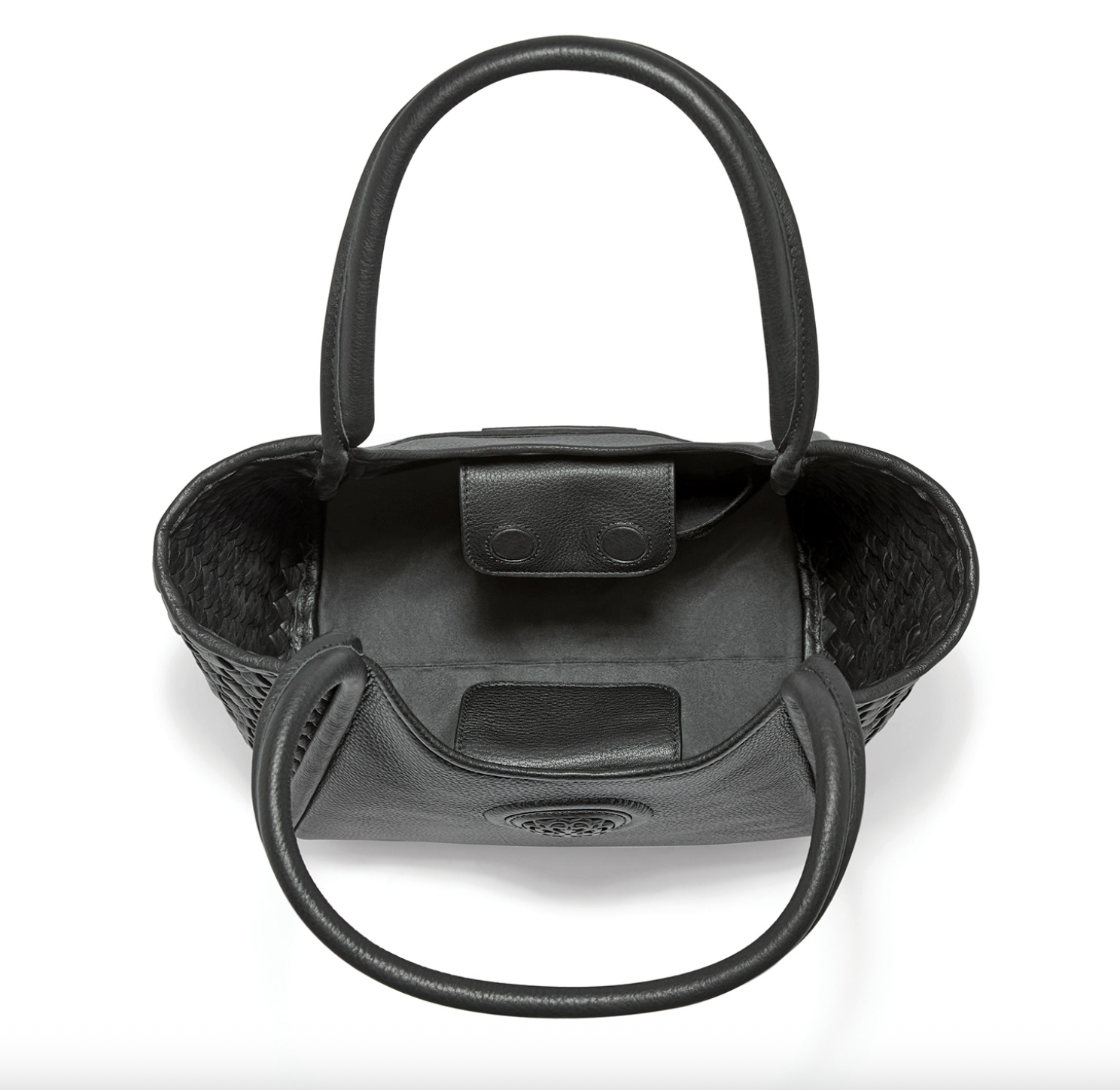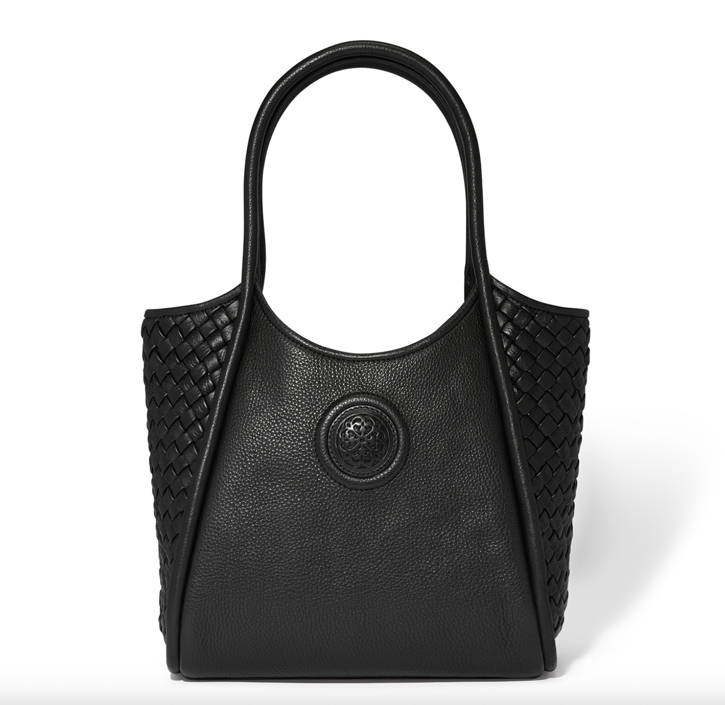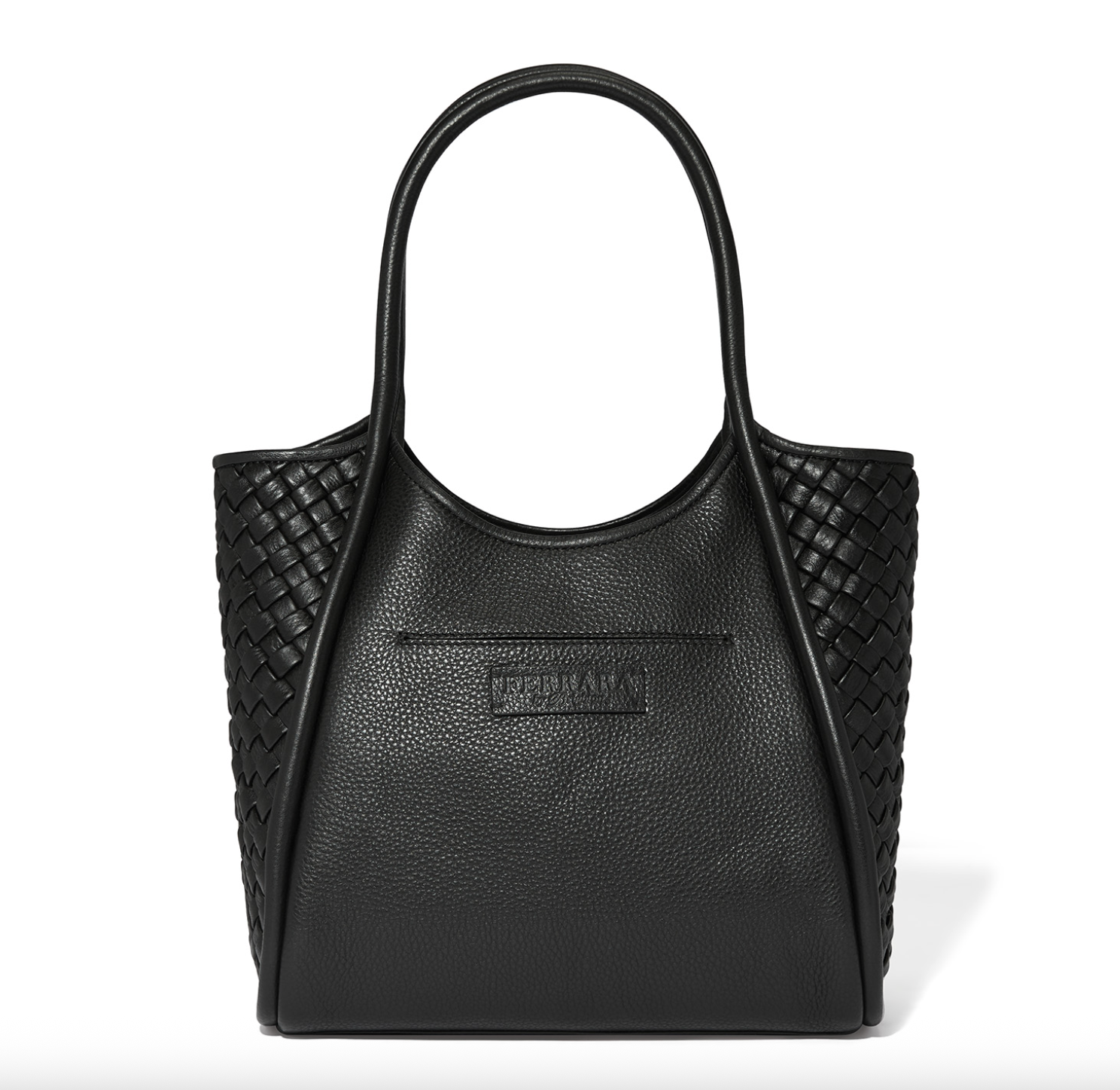 Herringbone handwoven front details accent the sophisticated silhouette in rich pebbled leather. It's the perfect size to carry all your essentials. Short handles and crossbody strap make it easy to pick it up and go on busy days.